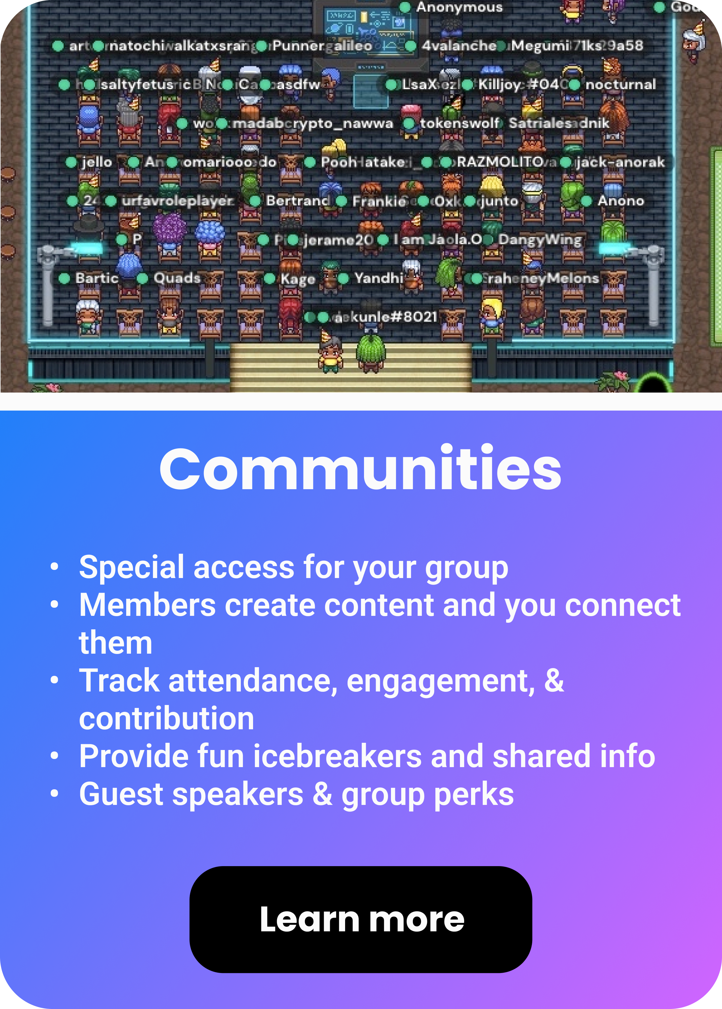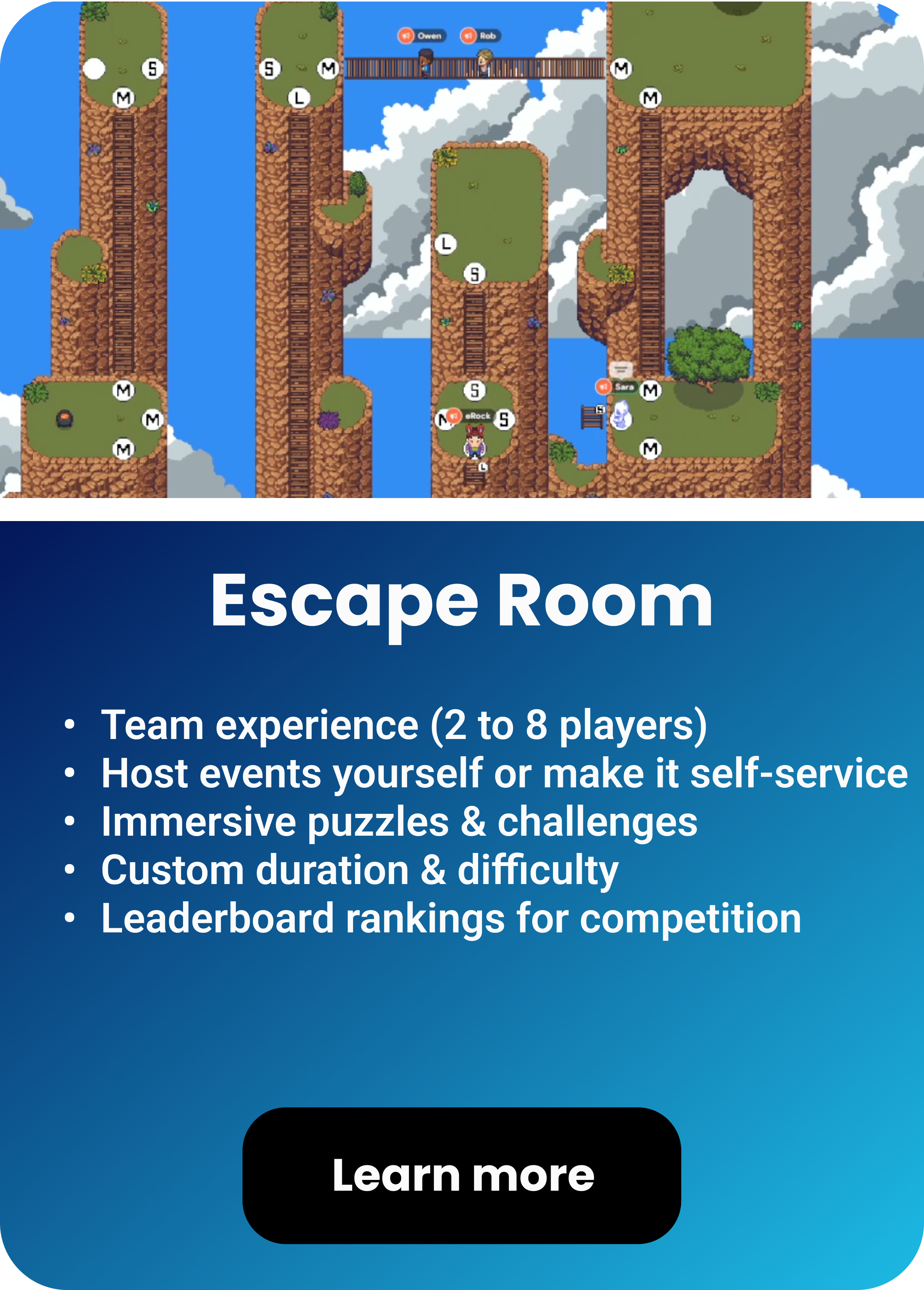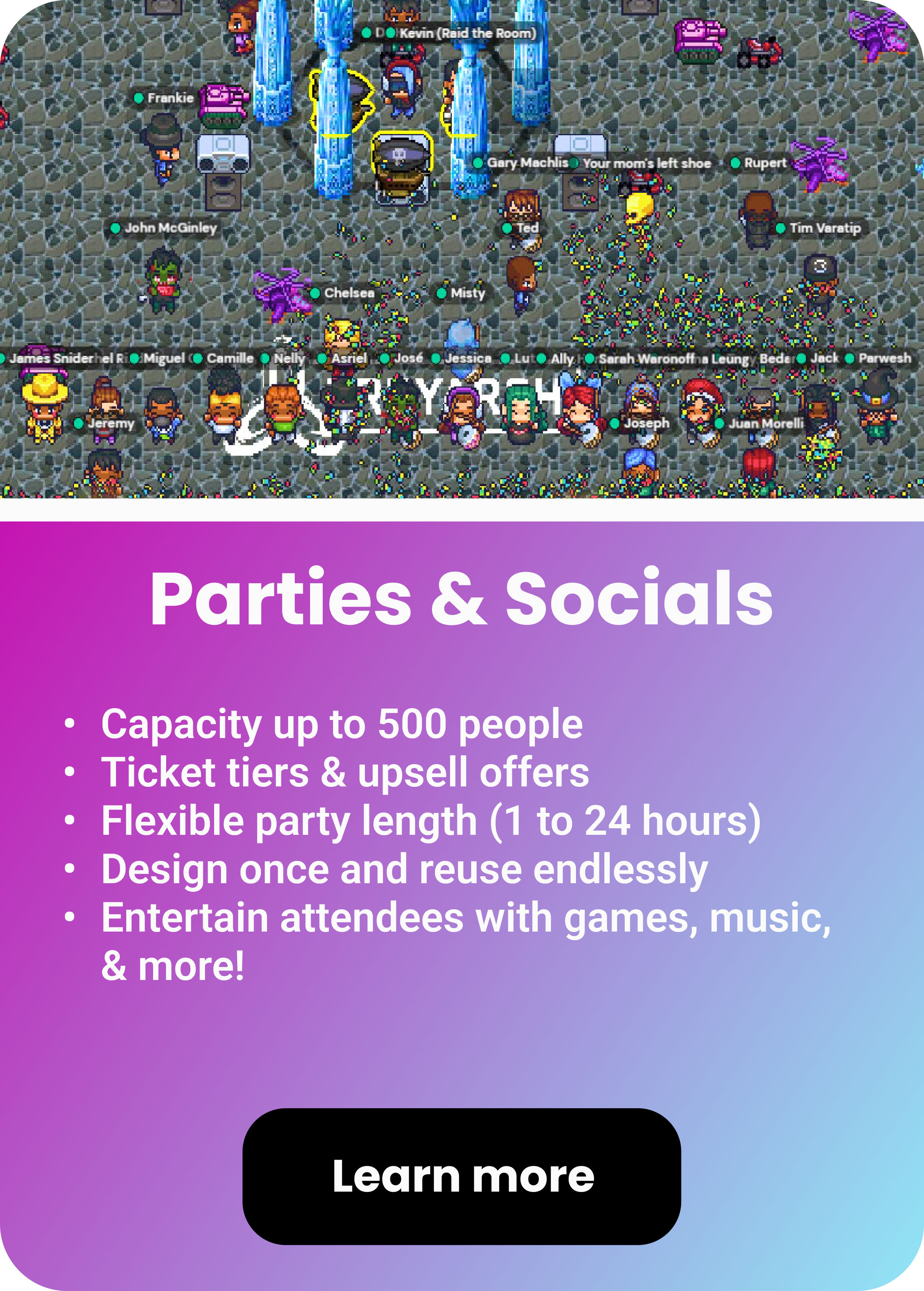 We take Gather Town to the next level by gamifying what you can do in your space. Our collaborative puzzles, dynamic environments, and inventive use of objects will make your events feel incredible!