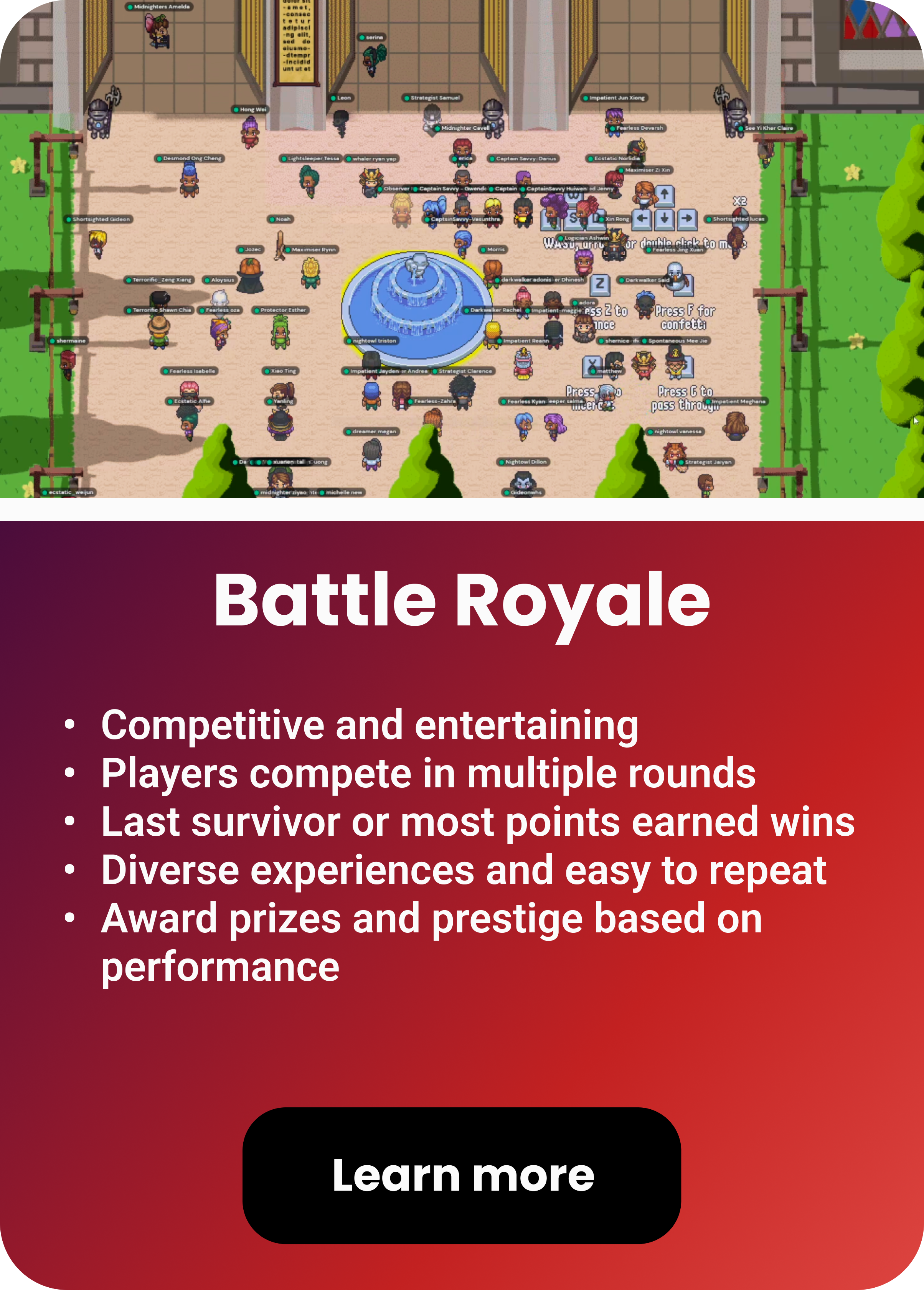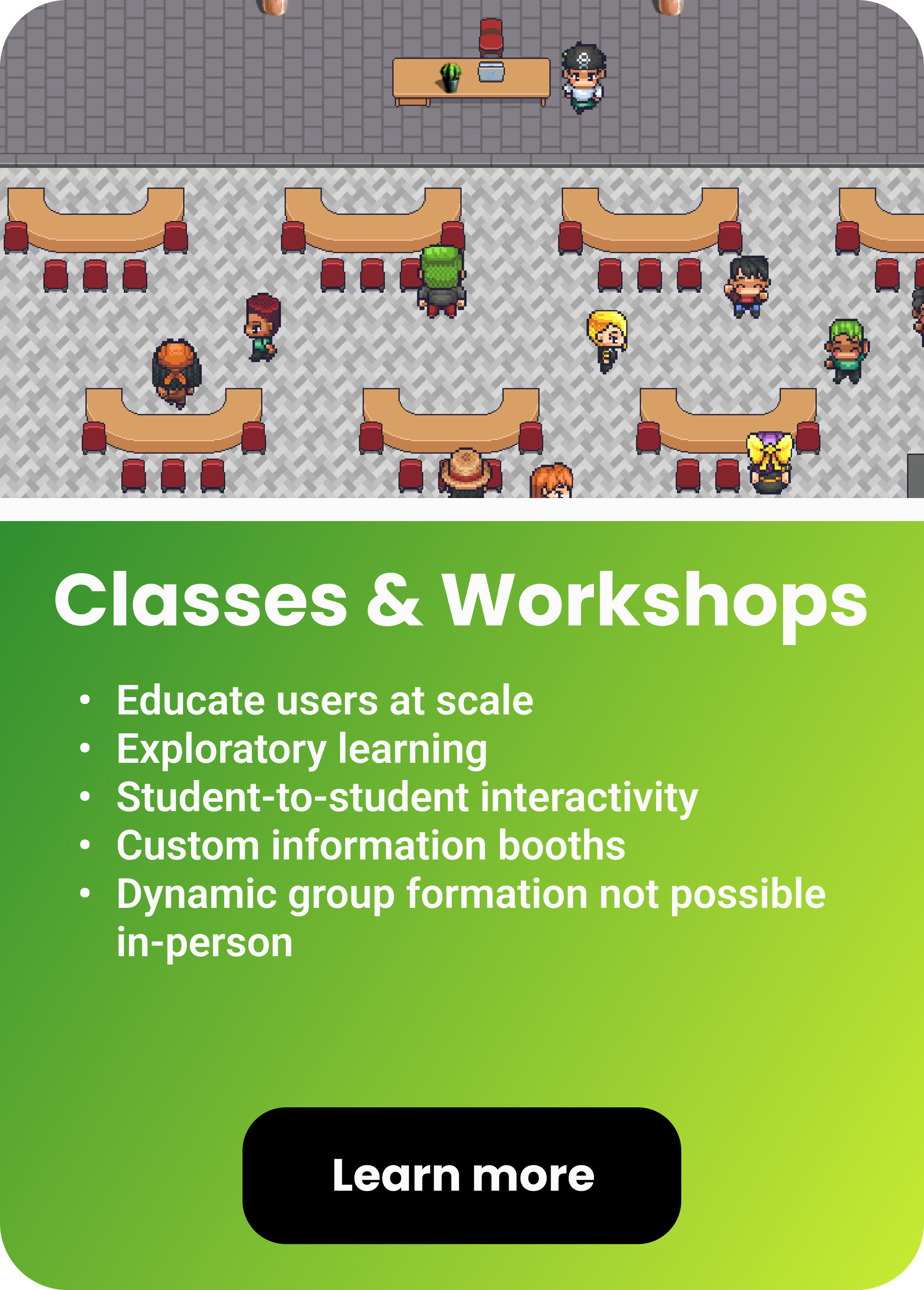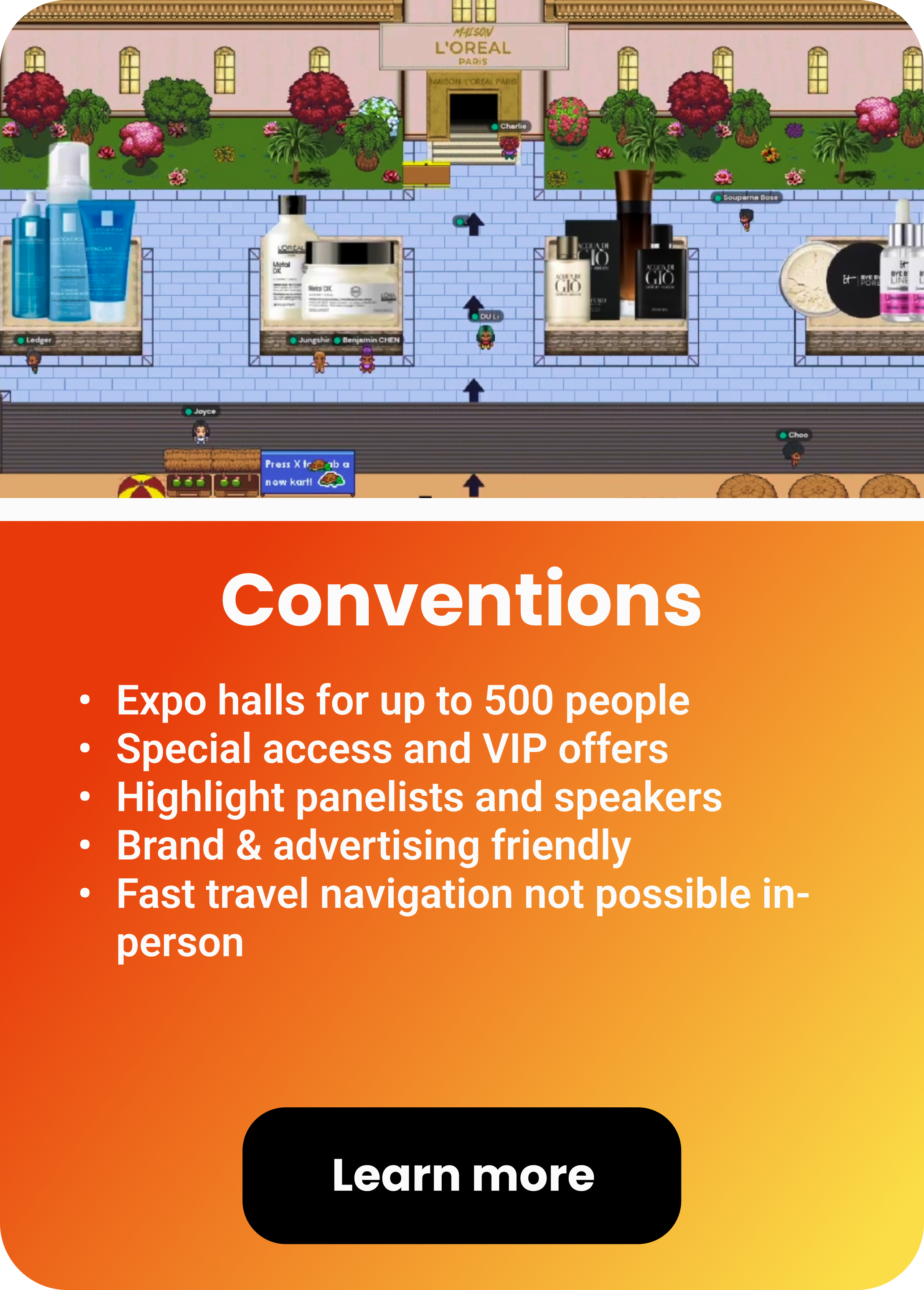 We take Gather Town to the next level by gamifying what you can do in your space. Our collaborative puzzles, dynamic environments, and inventive use of objects will make your events feel incredible!
