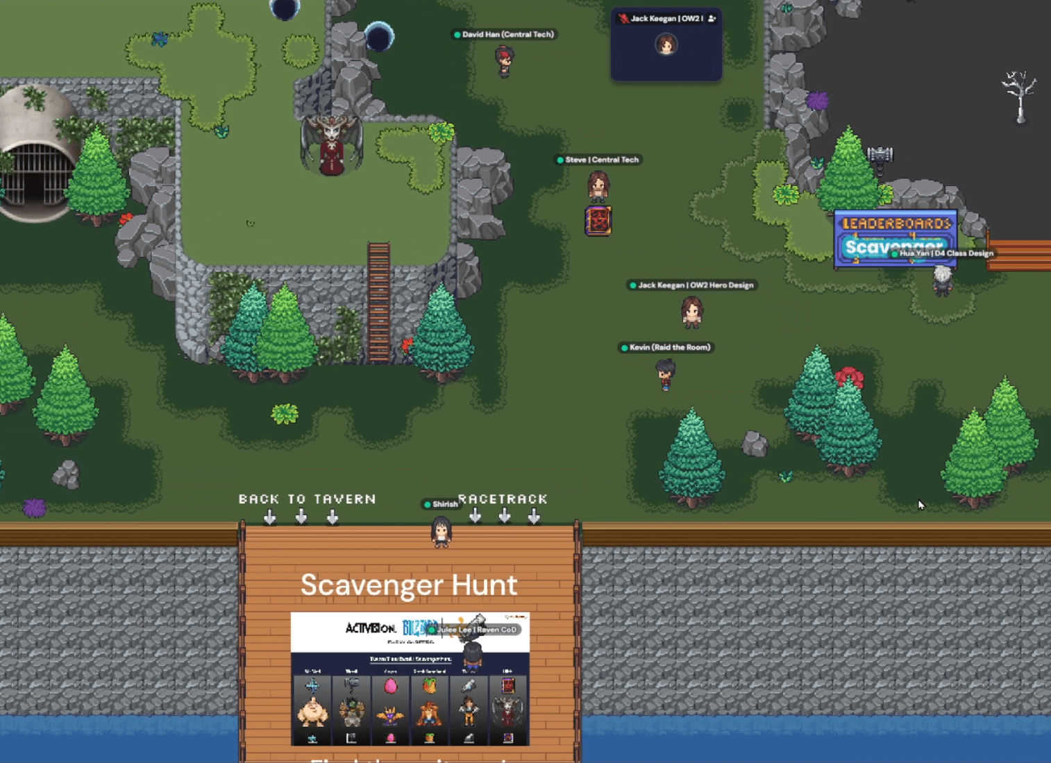Your team explores interactive virtual worlds together on Gather Town — solving puzzles, racing through challenges, and competing on live leaderboards.